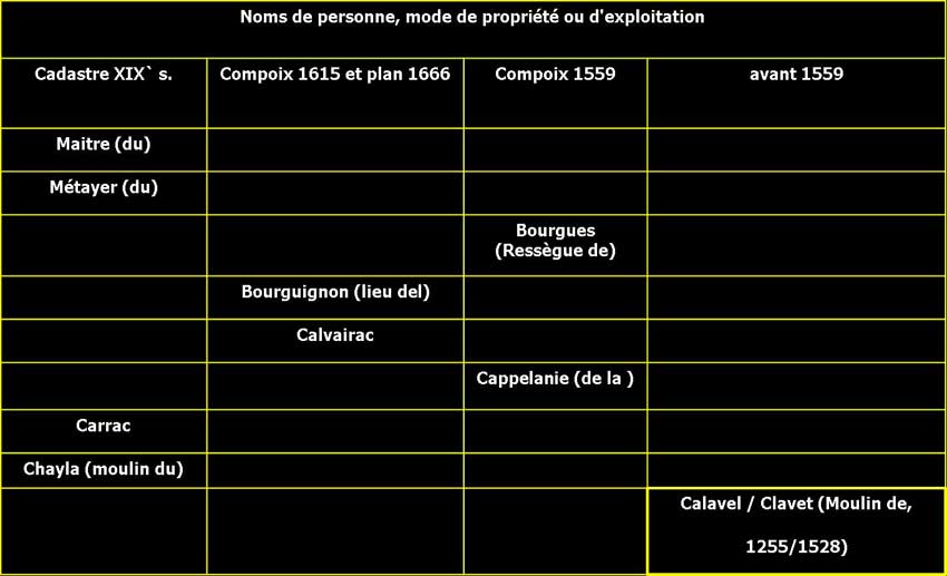 50. Supra, la méconnaissance du milieu local par le rédacteur de 1833 ; ces trois noms correspondent bien alors à des parcelles contiguës et elles sont dans le même secteur que celui désigné par les compoix sous les variantes citées.