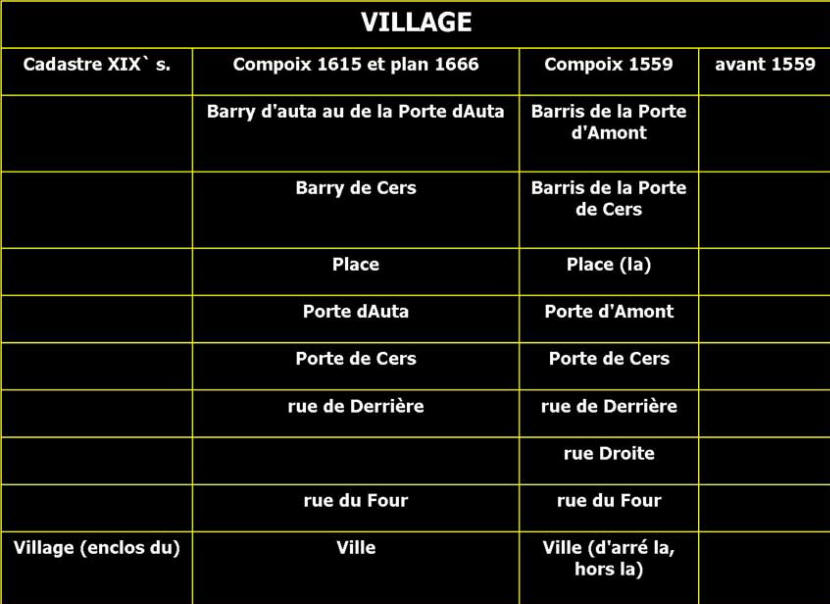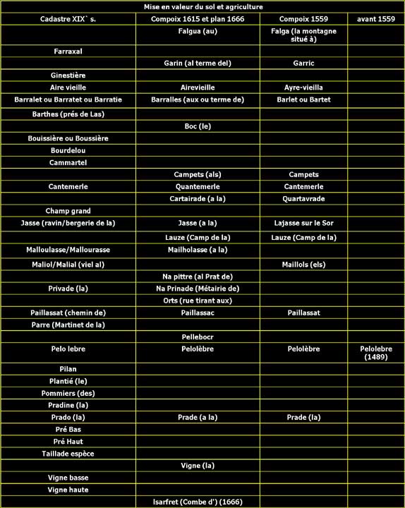 Il s'agit de deux compoix dressés en 1559 et en 1615 et de l'état des sections établi en 1833 (5). Ces documents, complétés par un plan d'arpentement de la forêt de Combe nègre (1666), ont permis de composer un répertoire fort d'environ 150 noms de lieux répartis sur l'ensemble du territoire.