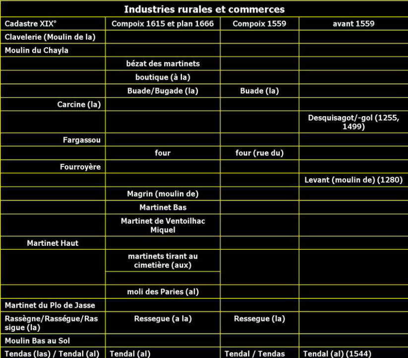 Les industries artisanales et le commerce, bien peu représentés en 1559 (6%), le sont davantage aux XVIIe et XIX` s. (13%). En 1833, on observe une tendance plus forte à utiliser les noms de personne ou désignant des modes de propriété ou d'exploitation (13% contre 10% et 8% dans les compoix), sans doute en corrélation avec l'augmentation des toponymes liés à la mise en valeur du sol et aux industries, en particulier les moulins et martinets. Enfin, ceux des noms affectés au réseau viaire ou à la topographie du village qui ont été utilisés comme toponymes sont peu nombreux, voire insignifiants en 1833, en grande partie à cause du système de numérotation du parcellaire.