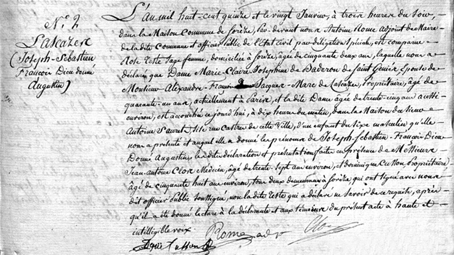 Acte de naissance d’Auguste de Las Cases : 20 janvier 1815 Soréze (Tarn)