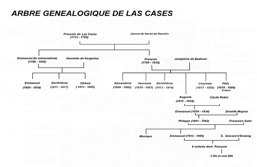 En effet, les cinq enfants de son second fils, Barthélémy, ont eu de nombreux descendants mais aucun ne porte plus le nom de Las Cases. En revanche, François de Las Cases, le frère de l’auteur du « Mémorial de Sainte-Hélène », a eu un fils, Auguste, homme au destin tragique, dont la femme, Cécile Robin, a engendré un seul fils, Emmanuel. Ce sont ses descendants qui vivent encore en Lozère et portent le nom de l’illustre compagnon d’exil de Napoléon Ier.