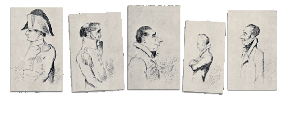 Série de caricatures réalisées par Denzil Ibbetson à bord du Northumberland entre le 7 et le 16 octobre 1815.