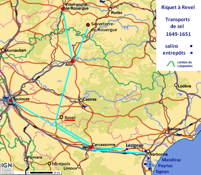 Lorsqu'il vient habiter Revel, en 1648, Riquet est donc sous-fermier des gabelles pour les circonscriptions de Mirepoix et de Castres (8). Il a certainement choisi le lieu de sa résidence de manière à pourvoir gérer ses affaires au mieux, et c'est probablement sa position géographique qui a valu à Revel d'avoir sa préférence. Cette bastide, créée en 1342, est située à peu près au milieu des territoires de son ressort. Elle est relativement proche de Toulouse où sont les bureaux de ses supérieurs immédiats. Et pour rejoindre Carcassonne, Narbonne et la côte méditerranéenne, elle bénéficie d'un chemin direct qui franchit la Montagne Noire en restant à une altitude raisonnable.