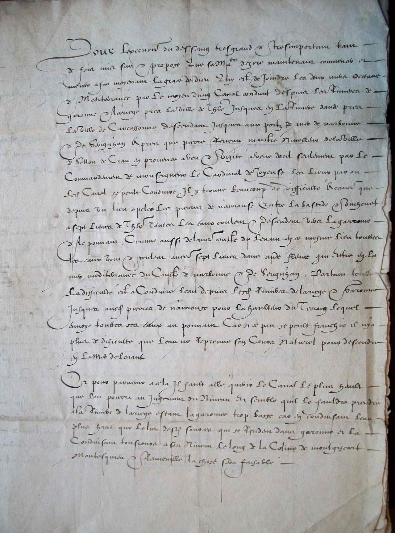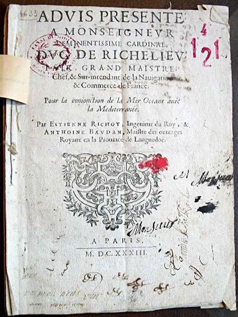Tout d'abord un « Avis » présenté en 1633 à Richelieu par Messieurs Richot et Baudan « Pour la conjonction de la Mer Océane avec la Méditerranée ».