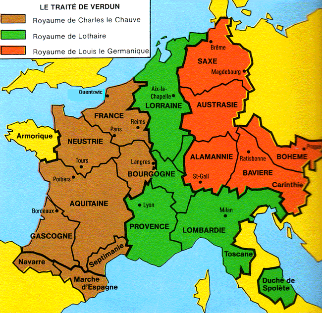 Après la mort de Charlemagne en 814, le traité de Verdun, en 843, modifie ce partage et l’empire est alors divisé en trois bandes verticales dont une des conséquences est le rattachement arbitraire des féodaux occitans au roi de France et à l’Empereur de Germanie.