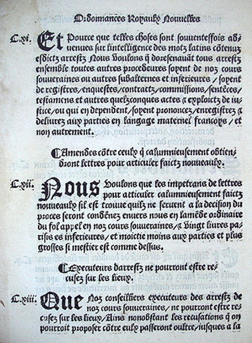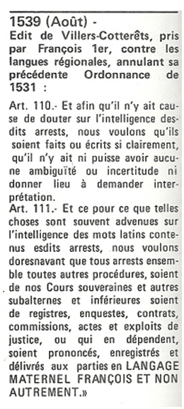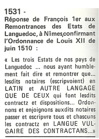Quelques années auparavant, en septembre 1539, François 1er avait promulgué l’Edit de Villers-Cotterêts, qui imposait la langue française dans les actes officiels et de justice en interdisant le latin et les langues régionales, dont la langue d’oc que parlent 1/3 des sujets du royaume. Cependant malgré le « bon plaisir » du Roi les limites des deux France ne peuvent s’effacer. La langue officielle du droit et de l’administration persiste et la langue d’oc se maintient sur le territoire désigné depuis longtemps sous le nom de Gascogne. Dès lors, ce terme pris dans son sens général, désigne bien l’ensemble des pays de langue d’oc, bien que pour certains la Provence n’y soit pas incluse.
