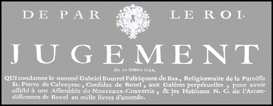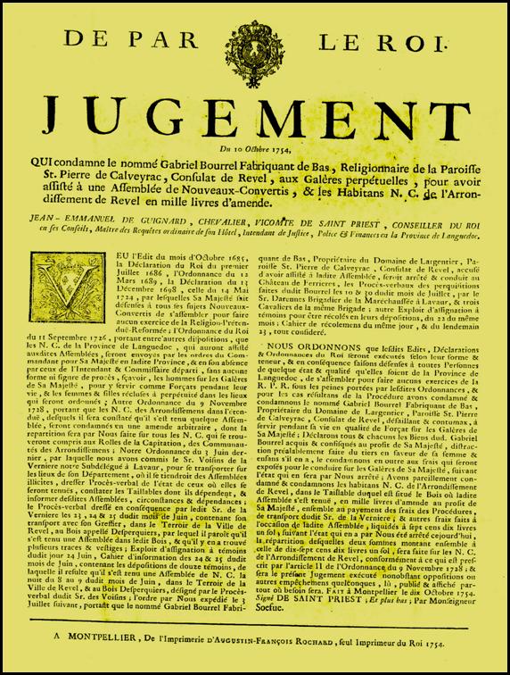 La déclaration du 14 mars 1724 codifiait toute la législation antiprotestante en précisant clairement les peines encourues pour ceux coupables d’assemblées : les galères à vie pour les hommes, la prison perpétuelle pour les femmes, et la peine de mort pour les porteurs d’armes.