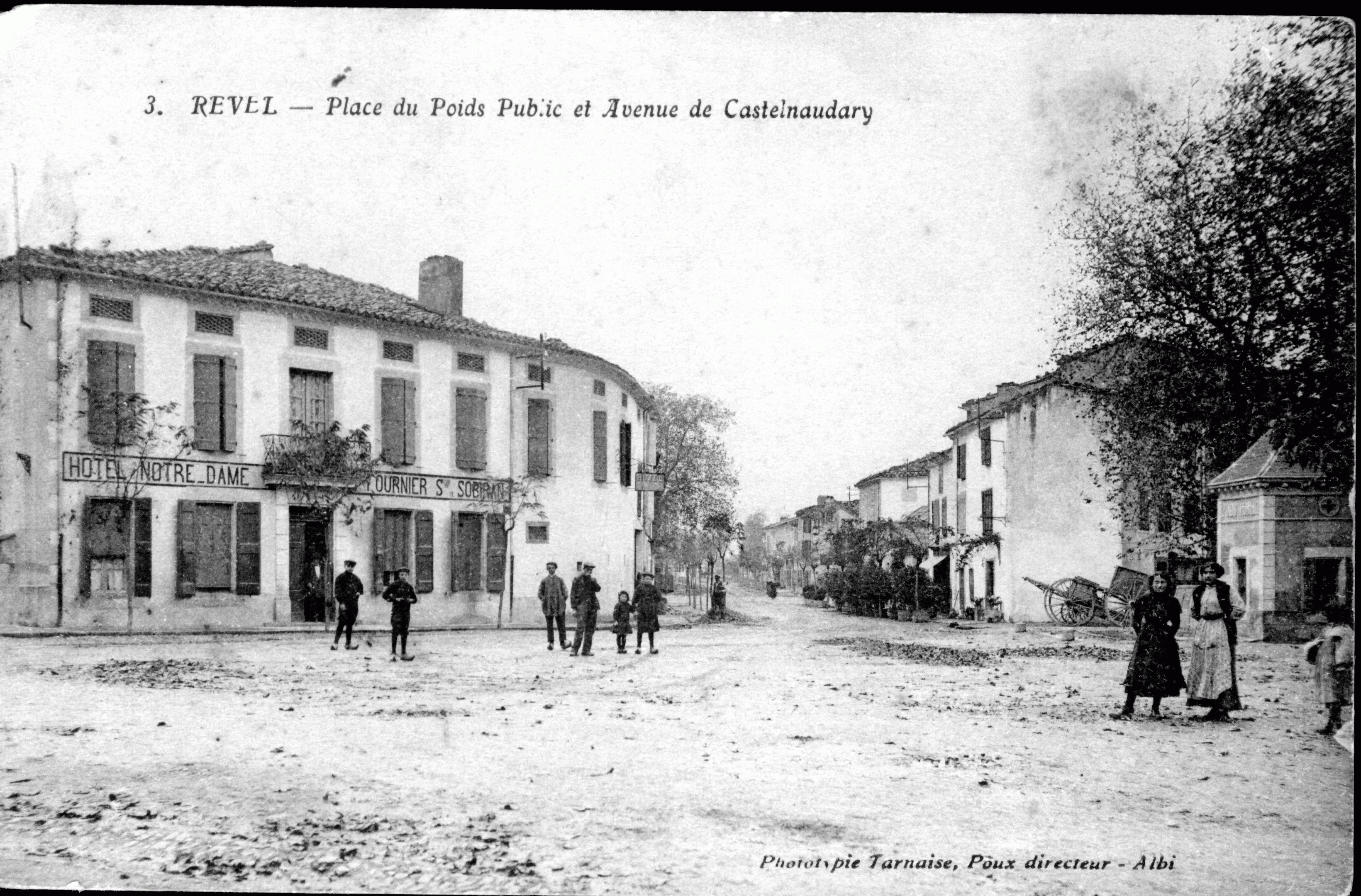 Une rencontre avec Madame Andrée Bilotte (1), adjointe à la Mairie de Roumens, il y a quelques années, nous a permis d’avoir accès à un document fort intéressant puisqu’il s’agit d’une « peinture naïve », représentant la place de la Mission de Revel au début du XXème siècle (2).