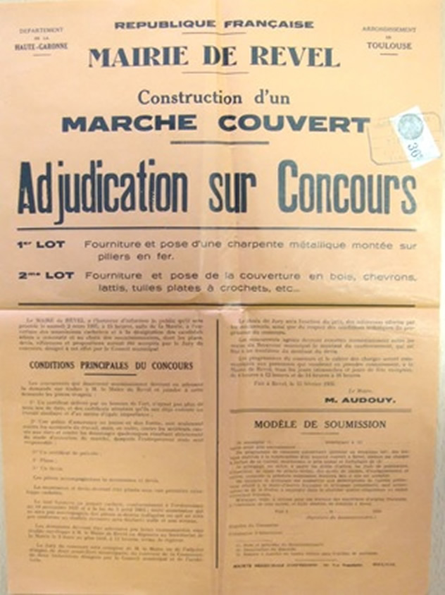 « Le Maire de Revel a l’honneur d’informer le public qu’il sera procédé le samedi 2 mars 1935, à 15 heures, salle de la Mairie, à l’ouverture des soumissions cachetées et à la désignation des candidats admis à concourir et au choix des soumissionnaires, dont les plans, devis, références et propositions auront été acceptés par le Jury du concours désigné à cet effet par le Conseil Municipal. »