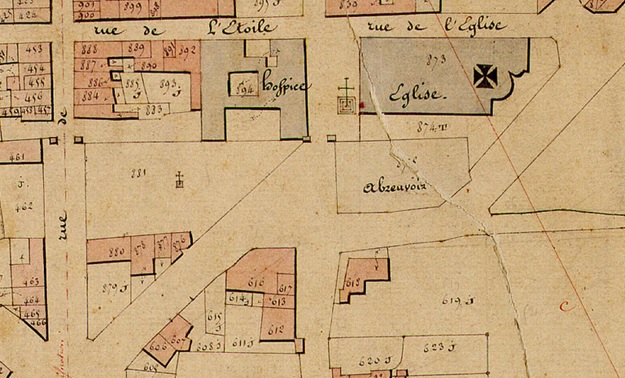 Le plan cadastral de 1830. Les croix sont bien situées. L’hospice barre le passage des « Escoussières ».