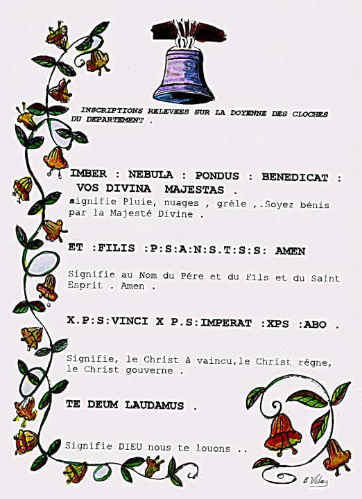 Ce son est d'ailleurs différent suivant l'endroit du village ou de la commune où on se trouve. On lit sur sa robe 3 inscriptions en lettres gothiques :