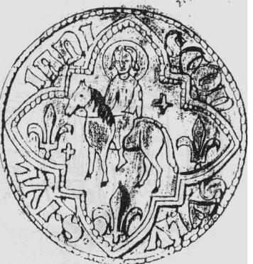 Au milieu du sceau, un cheval est monté par un cavalier dont la tête est entourée d'un nimbe.