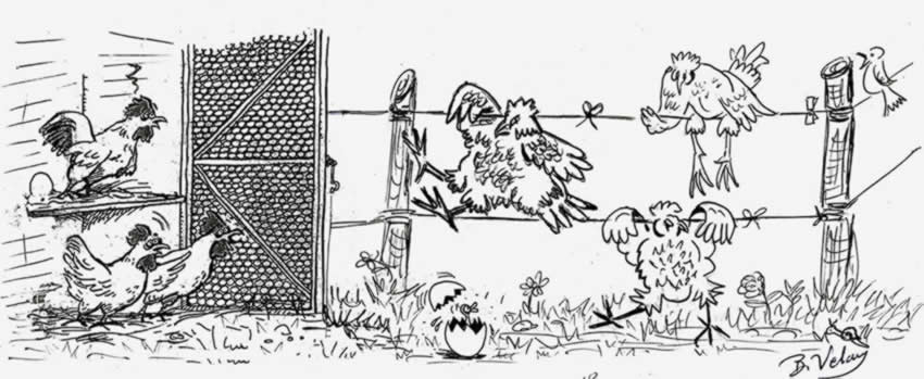 Notre Chantecler était ce que l'on appelle bien monté et cela était très utile avec la cinquantaine de poules qu'il devait contenter. Aussi, il n'avait pas fait dix pas qu'il se mettait à l'ouvrage et comme on disait d'un autre coq célèbre « Comme le coq d'En Paute, de sur une, il saute sur l'autre », notre Chantecler, avec son bec, accrochait la crinière de ses compagnes et de ses ergots, accrochait leur dos. A chaque coup dans le mille, ces caqueteuses en avaient pour leur argent et, passé ce moment, elles revenaient vite au poulailler en chantant pour y faire un bel œuf. La Sidonie était bien contente de son maître coq, d'autant que, quand une de ses poules devenait glousse, elle lui faisait couver dix huit œufs qui s'avéraient tous bons et cela donnait dix huit poussins qui venaient grossir le cheptel du poulailler en prouvant que notre chanteur «était aussi un bon père ».
